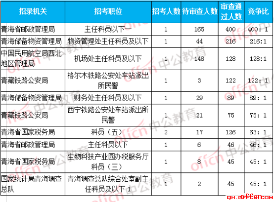 截至到2日16時,競爭比例的職位為青海省郵政管理局主任科員以下一職,招錄1人,截至到2日16時審核通過人數(shù)為400人,是此次國考青海地區(qū)競爭比例的一個職位!