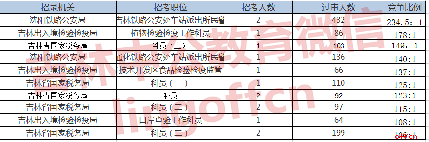 報名通過審核人數(shù)前十的職位主要集中在沈陽鐵路公安局、吉林國家稅務(wù)局、吉林出入境檢疫檢驗局等部門,具體信息如下: