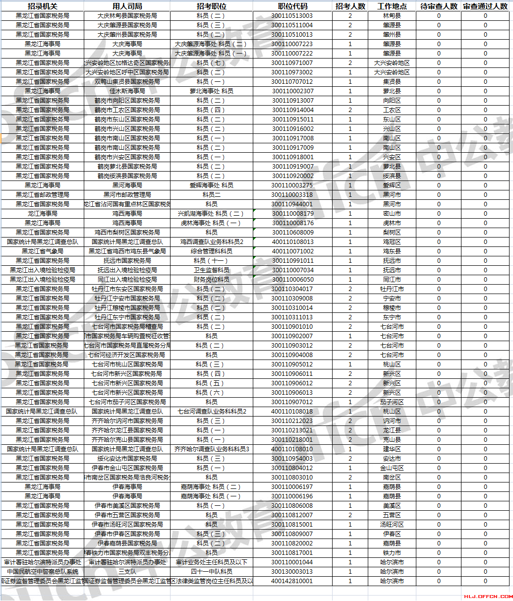 2018國(guó)家公務(wù)員考試報(bào)名時(shí)間已經(jīng)公布,報(bào)名時(shí)間為10月30日至11月8日,筆試時(shí)間為12月10日。報(bào)名已經(jīng)進(jìn)入第五天,仍有61個(gè)崗位無(wú)人報(bào)考,對(duì)此,中公網(wǎng)校為考生準(zhǔn)備了黑龍江省2018國(guó)家公務(wù)員考試報(bào)名人數(shù)無(wú)人報(bào)考崗位,以下是11月3日截止到11點(diǎn)的數(shù)據(jù),數(shù)據(jù)波動(dòng)比較大,以下信息僅供參考,具體報(bào)名人數(shù)以報(bào)名網(wǎng)站為準(zhǔn),考生可以收藏此頁(yè)面及時(shí)查看2018國(guó)考相關(guān)信息。