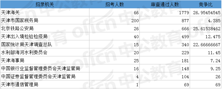 為幫助廣大考生更清晰的了解今日?qǐng)?bào)名情況,中公網(wǎng)校整理了審核通過(guò)人數(shù)前十位的部門(mén)以及競(jìng)爭(zhēng)比例最激烈的十大部門(mén),供廣大考生參考: