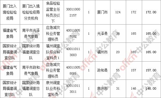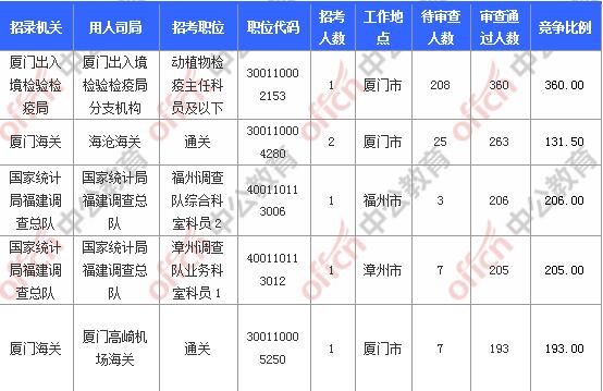 報名通過審核人數(shù)前十的職位主要集中在廈門出入境檢驗檢疫局、國家統(tǒng)計局福建調(diào)查總隊、廈門海關(guān)等部門,具體信息如下: