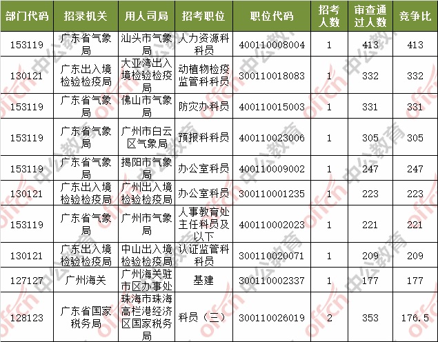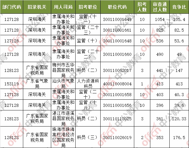 報(bào)名通過審核人數(shù)前十的職位主要集中在深圳海關(guān)、廣東省國家稅務(wù)局、廣東省氣象局等部門,具體信息如下:
