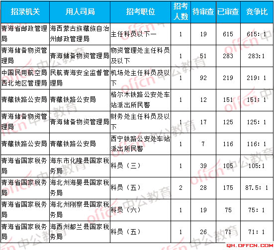 以下是3日16時各部門報名人數統(tǒng)計分析,其中中國民航青海安全監(jiān)督管理局、青海省物資儲備管理局、青海省郵政管理局等三個部門競爭最激烈,競爭比均超過116:1。