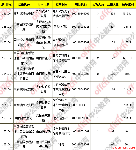 報名通過審核人數(shù)前十的職位主要集中在鄭州鐵路公安局、山西省國家稅務局、國家統(tǒng)計局山西調查總隊等部門,具體信息如下: