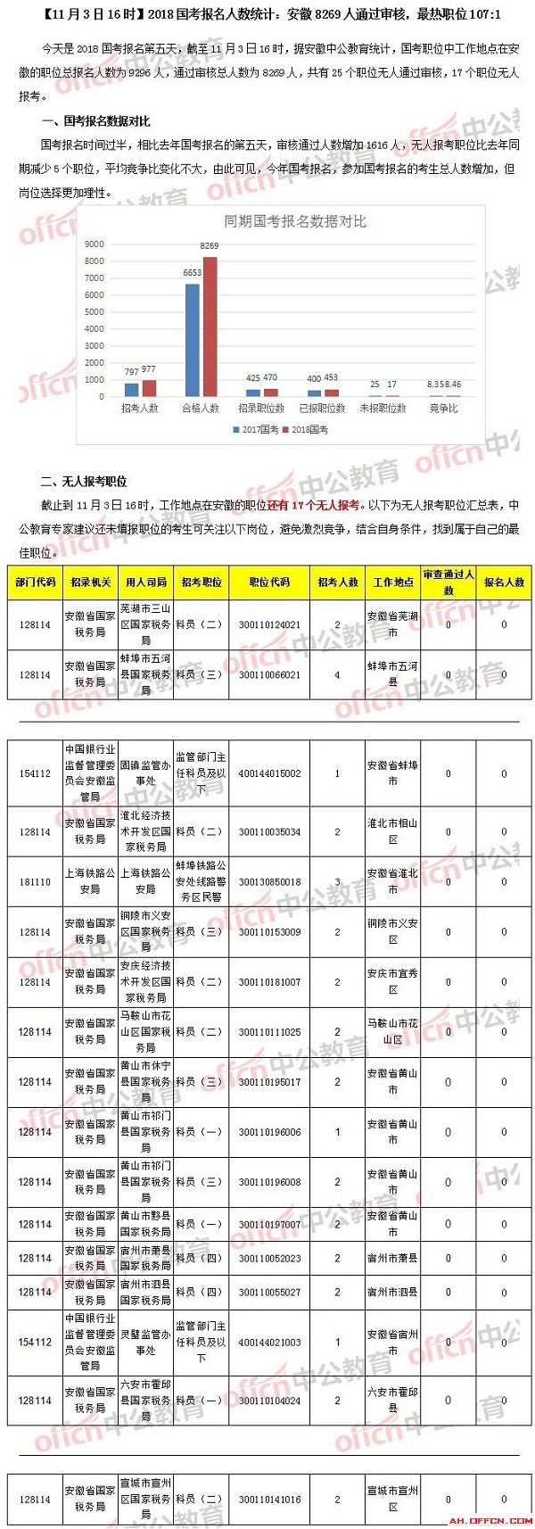 【11月3日16時(shí)】2018國(guó)考報(bào)名人數(shù)統(tǒng)計(jì):安徽8269人通過(guò)審核,最熱職位107:1