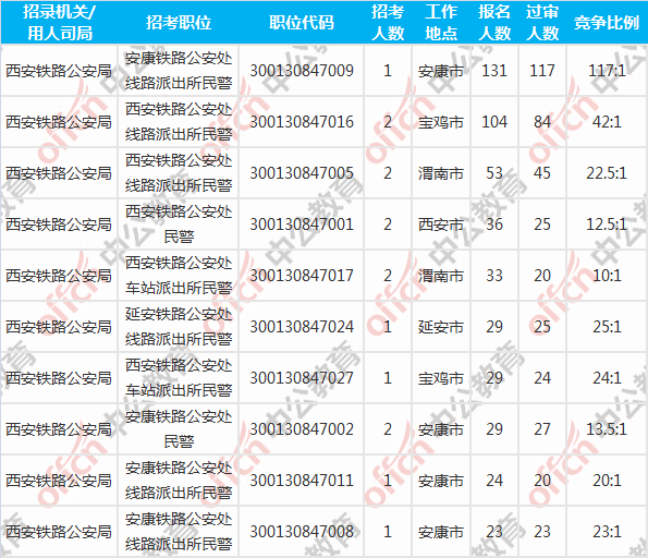截至11月3日16時,據(jù)陜西中公網(wǎng)校統(tǒng)計,陜西國考職位鐵路公安系統(tǒng)中待審核人數(shù)為:126人,通過審核總?cè)藬?shù)為553人,崗位平均競爭比例為8:1。