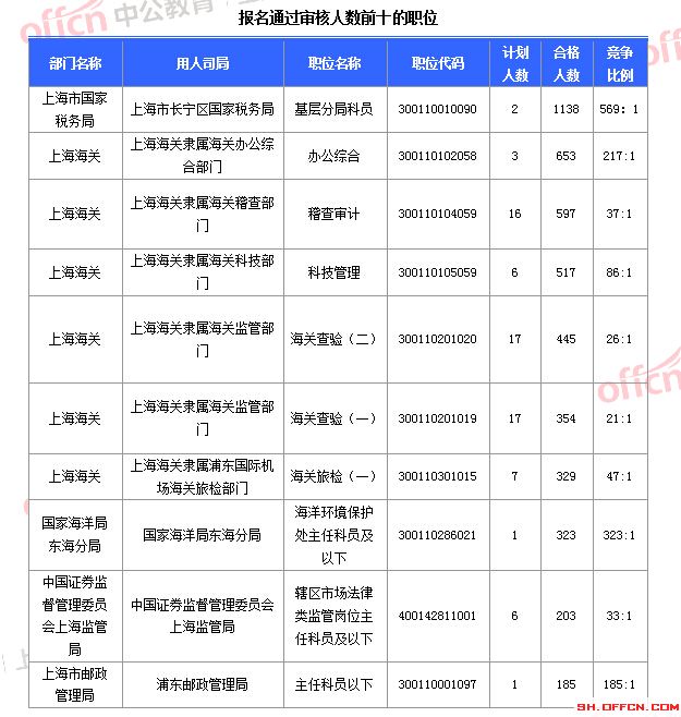 報(bào)名通過(guò)審核人數(shù)前十的職位主要集中在上海市國(guó)家稅務(wù)局、上海海關(guān)、國(guó)家海洋局東海分局等部門,具體信息如下: