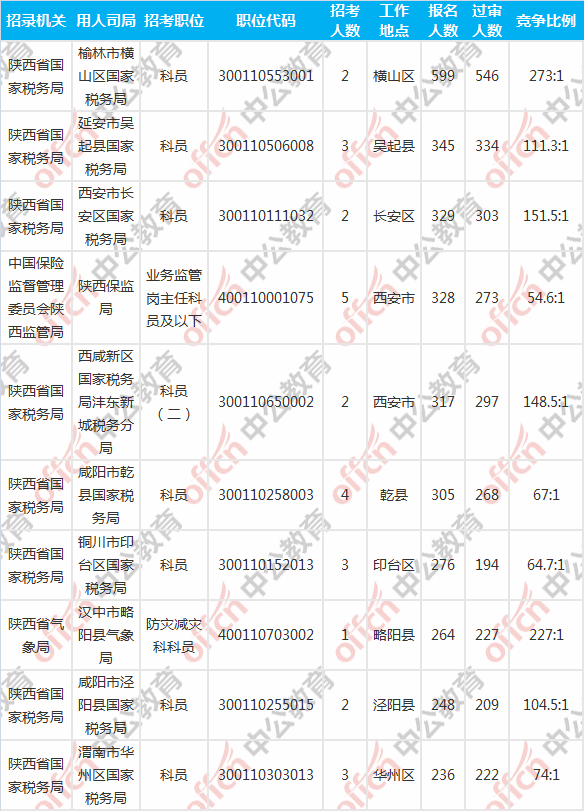 報(bào)名人數(shù)前十的職位主要集中在陜西省國(guó)家稅務(wù)局、中國(guó)保險(xiǎn)監(jiān)督管理委員會(huì)陜西監(jiān)管局、陜西省氣象局等部門(mén),具體信息如下: