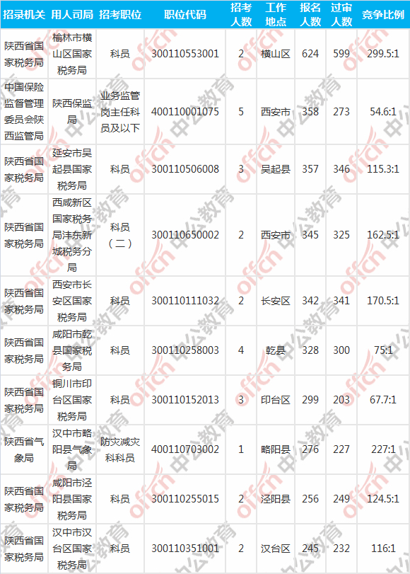 報(bào)名人數(shù)前十的職位主要集中在陜西省國家稅務(wù)局、中國保險(xiǎn)監(jiān)督管理委員會(huì)陜西監(jiān)管局、陜西省氣象局等部門,具體信息如下: