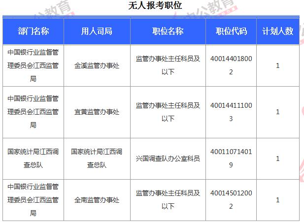 截止到4日16時,工作地點在江西的職位只有4個無人報考,僅占全部職位的1.3%。下面是無人報考職位一覽表,中公網(wǎng)校專家建議廣大考生多關注一些較冷職位,避免激烈競爭,結合自身條件,找到屬于自己的職位。