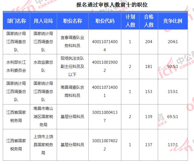 報名通過審核人數(shù)前十的職位主要集中在國家統(tǒng)計局江西調(diào)查總隊 水利部長江水利委員會 國家統(tǒng)計局江西調(diào)查總隊等部門,具體信息如下:
