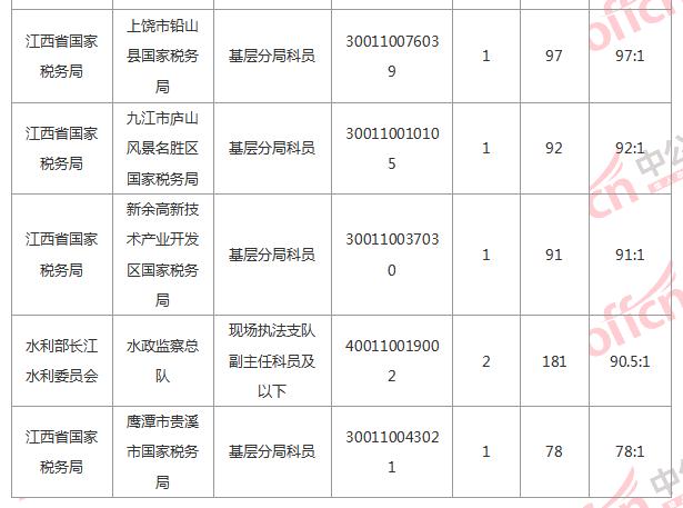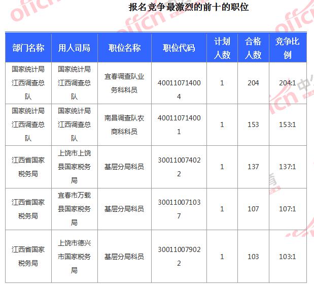 截止到4日16時,競爭比例的職位為國家統(tǒng)計局江西調(diào)查總隊國家統(tǒng)計局江西調(diào)查總隊宜春調(diào)查隊業(yè)務科科員一職,招錄1人,截止到4日16時通過人數(shù)為204人,位列第二的國家統(tǒng)計局江西調(diào)查總隊國家統(tǒng)計局江西調(diào)查總隊南昌調(diào)查隊農(nóng)商科科員一職,為153:1