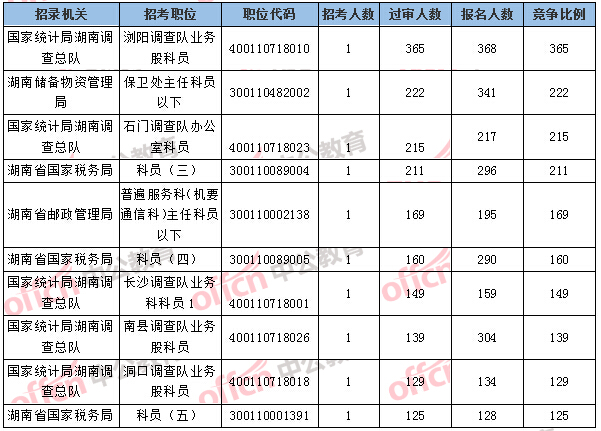 報(bào)名人數(shù)前十的職位主要集中在國(guó)家統(tǒng)計(jì)局湖南調(diào)查總隊(duì)、湖南省國(guó)家稅務(wù)局、湖南儲(chǔ)備物資管理局三個(gè)部門(mén),具體信息如下: