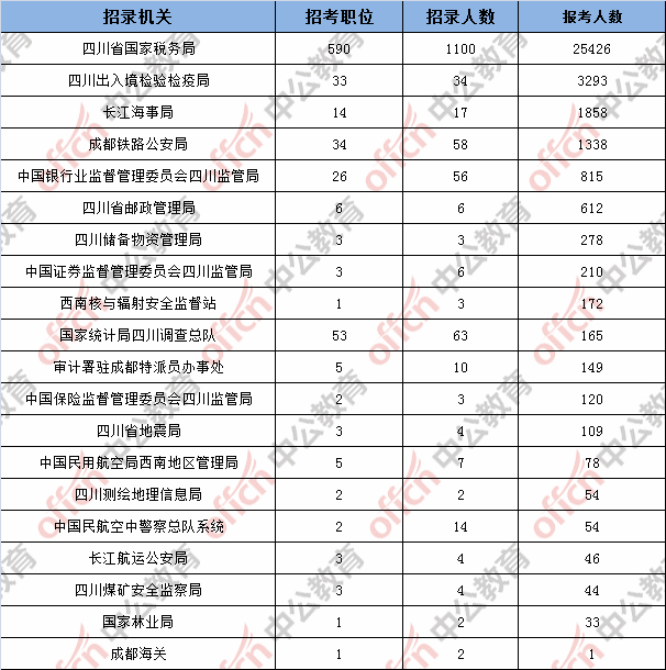 截至11月6日16時,據(jù)中公網(wǎng)校統(tǒng)計,2018國考招錄職位中工作地點(diǎn)在四川的職位通過審核總?cè)藬?shù)為34855人,共有14個職位暫無人報名,最熱職位競爭比例為633:1。