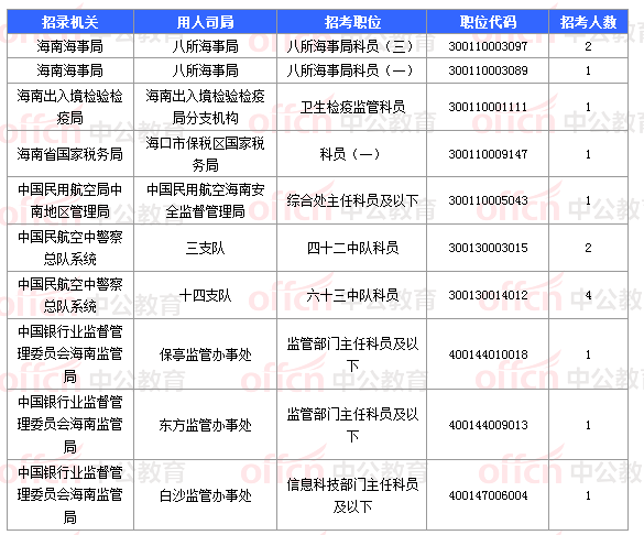 截止到6日16時(shí),工作地點(diǎn)在海南的職位共有10個(gè)無人報(bào)考,占全部職位的6.1%。下面是無人報(bào)考職位一覽表,中公網(wǎng)校專家建議廣大考生多關(guān)注一些較冷職位,避免激烈競爭,結(jié)合自身?xiàng)l件,找到屬于自己的職位。