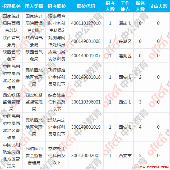 截至到6日16時,工作地點在陜西的,過審人數(shù)為0的職位共有7個。下面是過審人數(shù)為0 的報考職位一覽表,中公網(wǎng)校專家建議廣大考生再仔細看看職位表,千萬不要錯過了報名的時期。建議最晚不要超過6號報名,因為原則上資格審查是在報名后48小時內(nèi)進行,尤其是報名人數(shù)較多的職位,招考單位審核可能不會很及時,如果在8日18點之后才發(fā)現(xiàn)未通過資格審查,那就意味著你失去了這次參與國考的資格。