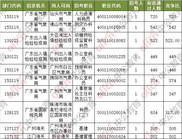 報名通過審核人數(shù)前十的職位主要集中在深圳海關、廣東省氣象局、珠海出入境檢驗檢疫局等部門,具體信息如下: