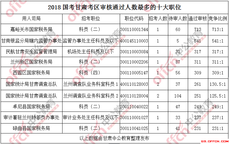 報(bào)名通過審核人數(shù)前十的職位主要集中在嘉峪關(guān)市國家稅務(wù)局、甘南銀監(jiān)分局轄內(nèi)監(jiān)管辦事處、民航甘肅安全監(jiān)督管理局部門,具體信息如下: