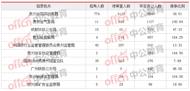 截至11月6日16時(shí),據(jù)中公網(wǎng)校統(tǒng)計(jì),國考職位中工作地點(diǎn)在貴州的職位報(bào)名人數(shù)達(dá)到45145人,通過審核總?cè)藬?shù)為34838人,共有4個(gè)職位無人報(bào)名,平均競(jìng)爭(zhēng)比例為38:16。