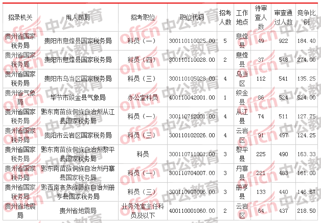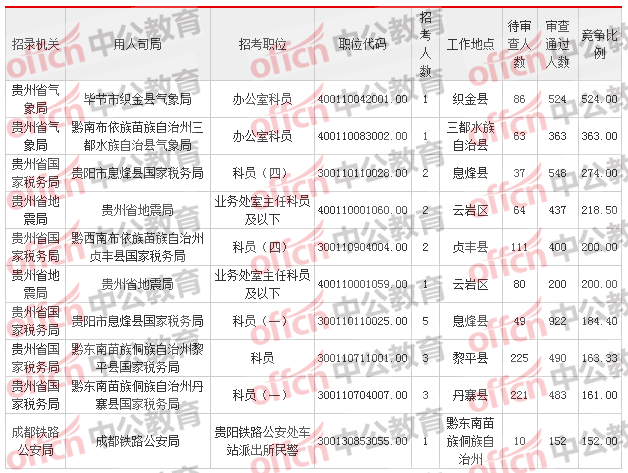 報名通過審核人數(shù)前十的職位主要集中在貴州省國家稅務局、貴州省氣象局這兩個部門,具體信息如下: