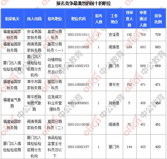 截止到7日9時(shí),工作地點(diǎn)在福建的職位共有7個(gè)無人報(bào)考,占全部職位的3.16%。下面是無人報(bào)考職位一覽表,中公網(wǎng)校專家建議廣大考生多關(guān)注一些較冷職位,避免激烈競爭,結(jié)合自身?xiàng)l件,找到屬于自己的職位。