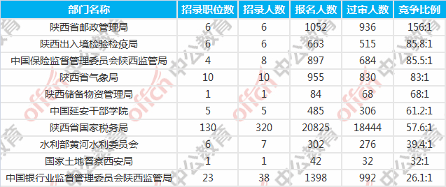 報名人數(shù)前十的職位主要集中在陜西省國家稅務局、中國保險監(jiān)督管理委員會陜西監(jiān)管局、陜西省氣象局等部門,具體信息如下: