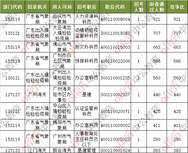 報(bào)名通過審核人數(shù)前十的職位主要集中在深圳海關(guān)、廣東省氣象局、珠海出入境檢驗(yàn)檢疫局等部門,具體信息如下: