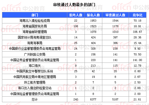截至11月7日16時,據(jù)中公網(wǎng)校統(tǒng)計,國考職位中工作地點在海南的職位通過審核總?cè)藬?shù)為5187人,共有8個職位無人通過審核,其中還有部分待審核的人數(shù)高達1190人,平均競爭比例為21.61:1。