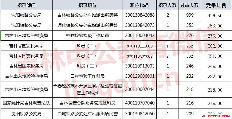 報名通過審核人數(shù)前十的職位主要集中在沈陽鐵路公安局、吉林國家稅務局等部門,具體信息如下: