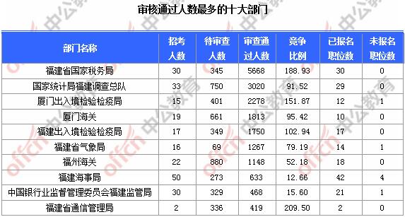 截止到7日16時(shí),通過審核人數(shù)前三位的部門依次是:福建省國家稅務(wù)局、國家統(tǒng)計(jì)局福建調(diào)查總隊(duì)、廈門出入境檢驗(yàn)檢疫局,三部門通過審核總?cè)藬?shù)達(dá)10966人,占通過審核總?cè)藬?shù)的56.54%。