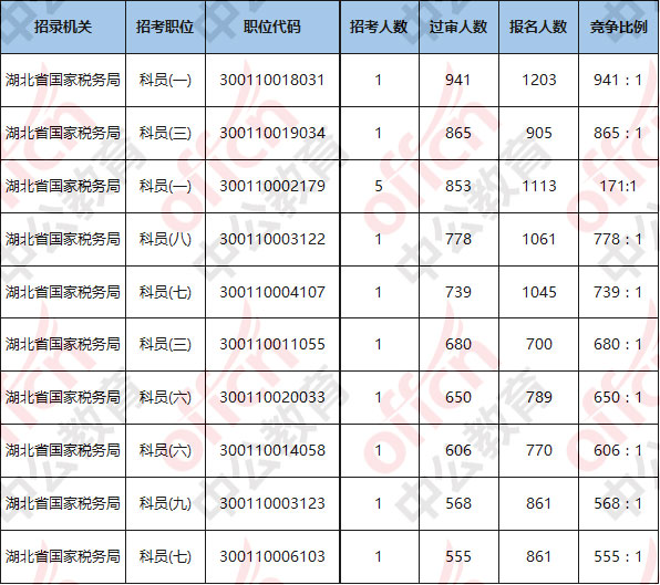 截止到7日16時,競爭比例的職位為湖北省國家稅務(wù)局科員(一)一職,招錄1人,截止到7日16時通過人數(shù)為941人。