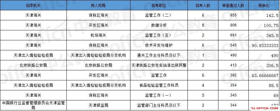 報名通過審核人數(shù)前十的職位主要集中在天津海關(guān)、北京鐵路公安局、天津出入境檢驗檢疫局等部門,具體信息如下: