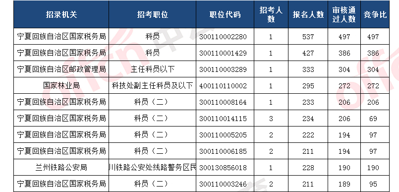 截止到11月8日9時(shí),報(bào)名通過審核人數(shù)前十的職位主要為寧夏回族自治區(qū)國家稅務(wù)局、寧夏回族自治區(qū)郵政管理局,具體信息如下: