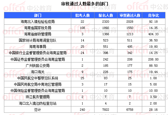 截止到8日16時(shí),通過審核人數(shù)前三位的部門依次是:海南出入境檢驗(yàn)檢疫局海南省國家稅務(wù)局、海南省郵政管理局、,三部門通過審核總?cè)藬?shù)達(dá)4791人,占通過審核總?cè)藬?shù)的70.09%。