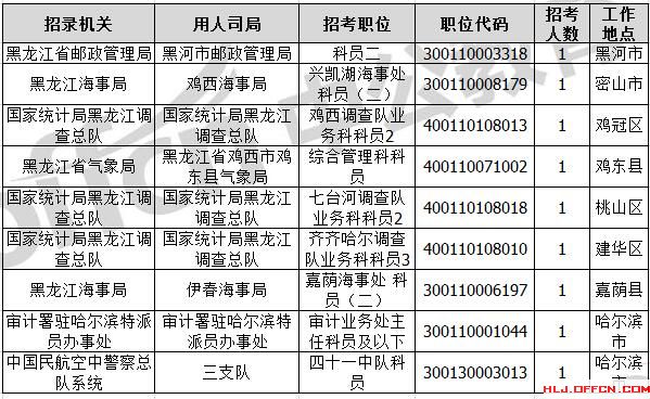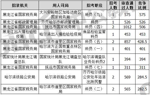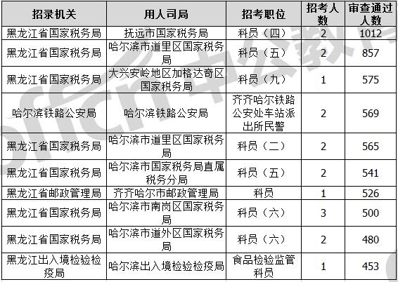 報(bào)名通過審核人數(shù)前十的職位主要集中在黑龍江省國(guó)家稅務(wù)局、哈爾濱鐵路公安局、黑龍江省郵政管理局等部門,具體信息如下: