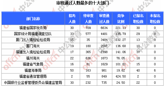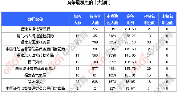 為幫助廣大考生更清晰的了解今日報(bào)名情況,福建中公網(wǎng)校專家整理了審核通過人數(shù)前十位的部門以及競爭比例最激烈的十大部門,供廣大考生參考: