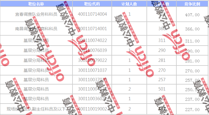 截止到8日17:30時,競爭比例的職位為國家統(tǒng)計局江西調查總隊國家統(tǒng)計局江西調查總隊宜春調查隊業(yè)務科科員一職,招錄1人,截止到8日17:30時通過人數(shù)為407人,競爭比為407:1