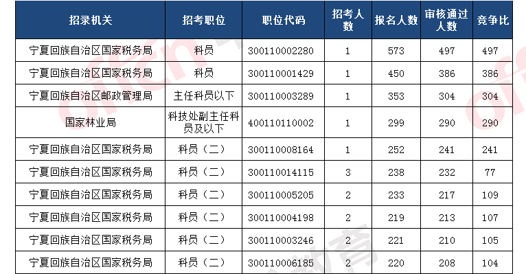 截止到11月8日17時(shí)30分,報(bào)名通過(guò)審核人數(shù)前十的職位主要為寧夏回族自治區(qū)國(guó)家稅務(wù)局、寧夏回族自治區(qū)郵政管理局,具體信息如下: