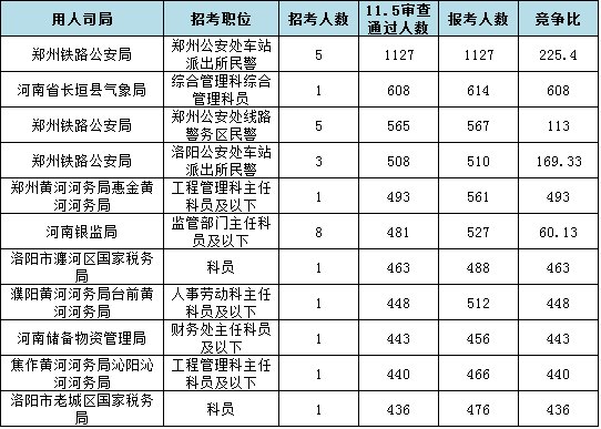 報名通過審核人數(shù)前十的職位主要集中在鄭州鐵路公安局、河南省氣象局、河南省國家稅務局,具體信息如下: