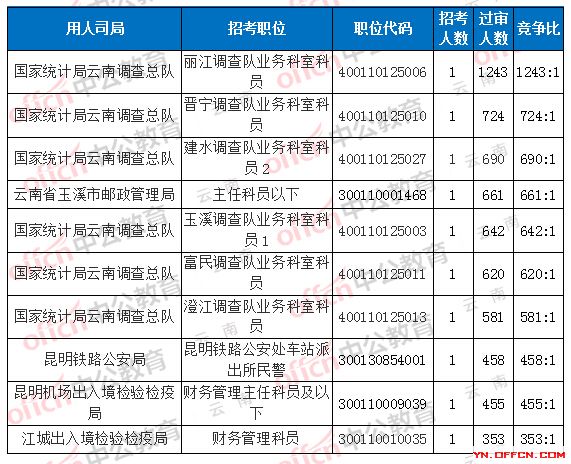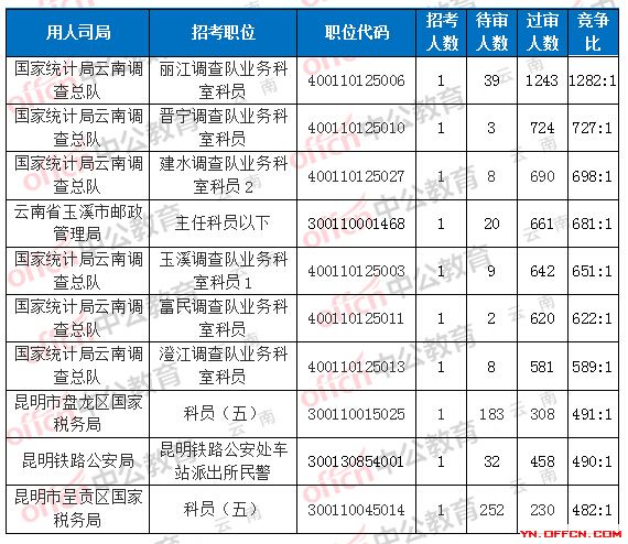 截止報(bào)名結(jié)束前最受歡迎的崗位是國家統(tǒng)計(jì)局云南調(diào)查總隊(duì),麗江調(diào)查隊(duì)業(yè)務(wù)科室科員,職位代碼:400110125006,招錄1人,1282人報(bào)名,其中39人待審核通過,詳情如下圖: