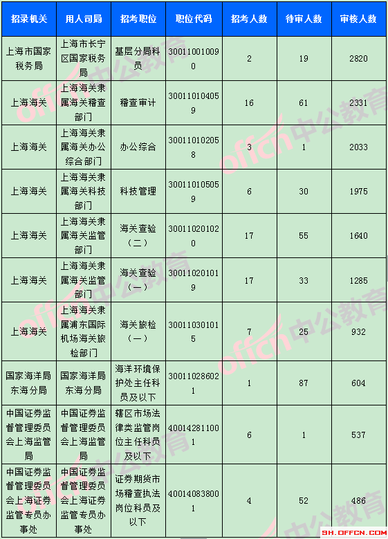 報名通過審核人數(shù)前十的職位主要集中在上海市國家稅務(wù)局、上海海關(guān)等部門,具體信息如下: