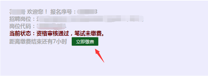 2、登錄后,如果當(dāng)前狀態(tài)提示“資格審核通過,筆試未繳費”,可點擊狀態(tài)后面的“立即繳費”按鈕進(jìn)行繳費。