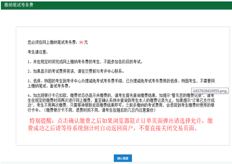 3、進(jìn)入繳納筆試考務(wù)費頁面,請考生仔細(xì)閱讀注意事項和特別提醒。