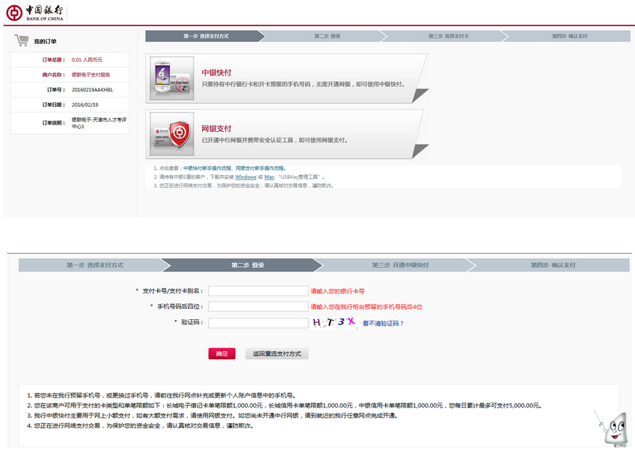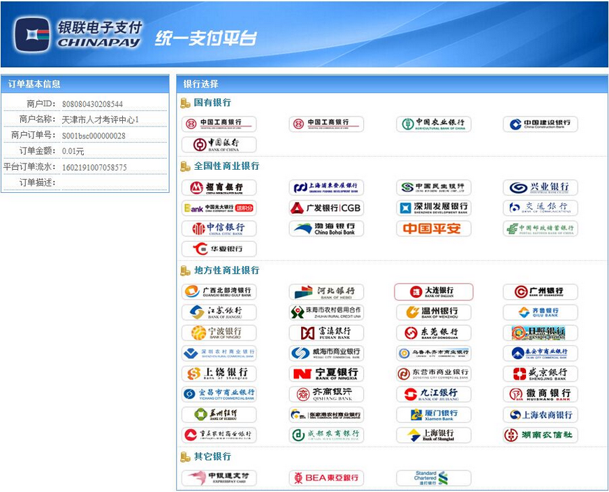 僅以天津市事業(yè)單位考試,中國銀行網(wǎng)上支付為例,演示網(wǎng)上繳費操作流程。