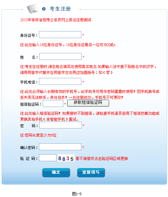未注冊考生請注冊后再登錄,點(diǎn)擊圖1-4中的‘注冊新用戶’進(jìn)入注冊頁面如圖1-5,請考生按提示填寫注冊信息。點(diǎn)擊‘確定’提交注冊信息,注冊后將返回圖1-4頁面進(jìn)行登錄(返回登陸時(shí)自動(dòng)把身份證號(hào)填充到身份證號(hào)文本框內(nèi))。