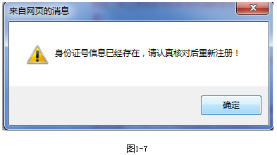 2、相同的身份證號(hào)只允許注冊一次,如多次注冊,則會(huì)提示錯(cuò)誤,如圖1-7所示: