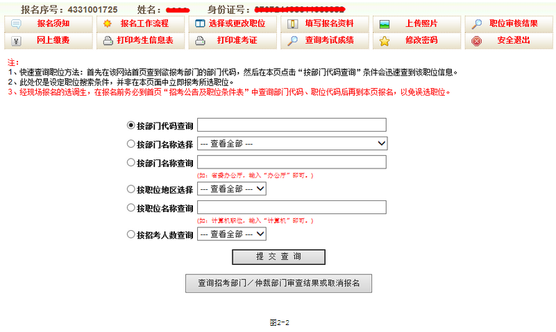 2、點(diǎn)擊‘選擇錄用職位’進(jìn)入職位查詢界面如圖2-2,可以按照不同條件查詢招考職位的情況。