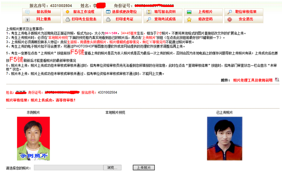 4、點擊‘上傳照片’按鈕,顯示‘已上傳照片,未審核,請等待審核!’如圖4-6,查看照片是否通過,可在圖4-6的頁面進行查看。需要注意:每次上傳或更換照片后必按F5鍵刷新,否則有可能在“本地照片預(yù)覽”框內(nèi)看到的是上一次的照片,導致上傳后的并非本人??忌牲c擊“不合格照片示例”按鈕查看不符合要求的照片(僅做示例)。