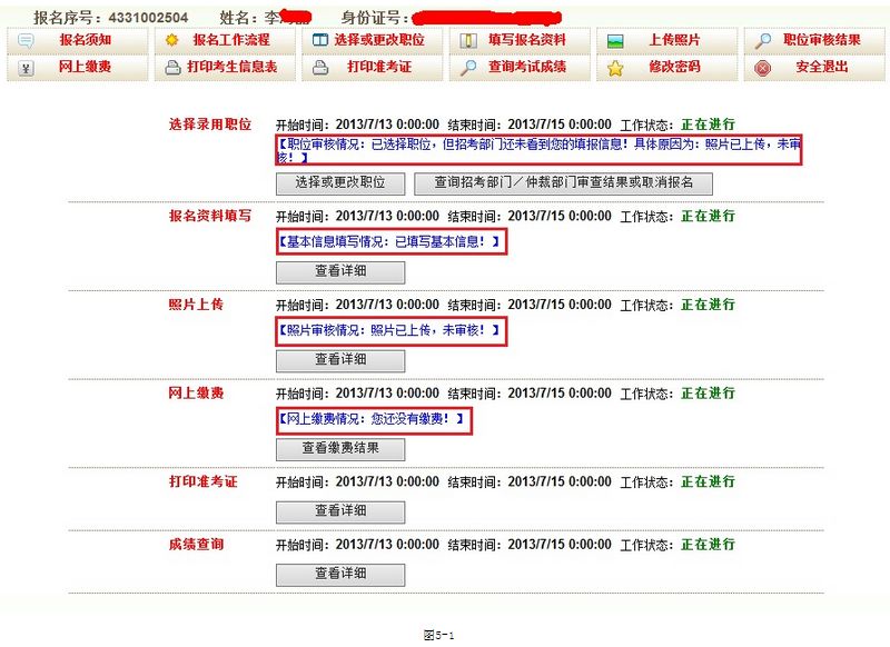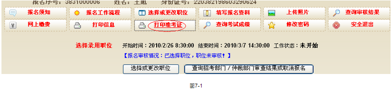 2、打印準(zhǔn)考證的時(shí)間在‘報(bào)名工作流程’下的‘打印準(zhǔn)考證’位置查看,如圖7-1