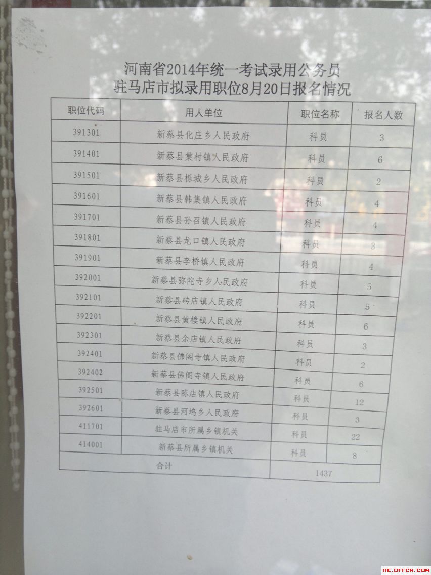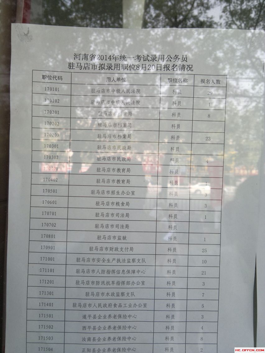 2014年河南省公務(wù)員考試駐馬店現(xiàn)場報名人數(shù)統(tǒng)計表